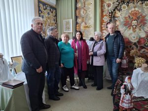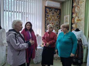 Надія ВАКУЛЕНКО провела для гостей екскурсію Виставковою залою та майстернями. Варто сказати, що вони проявили інтерес до вишитих панно, які прикрашають вікна Центру, а також спробували себе у килимарстві.